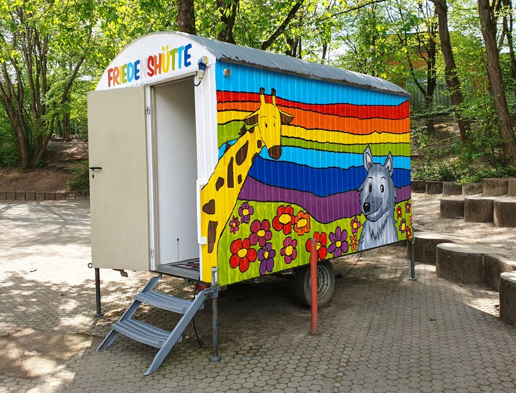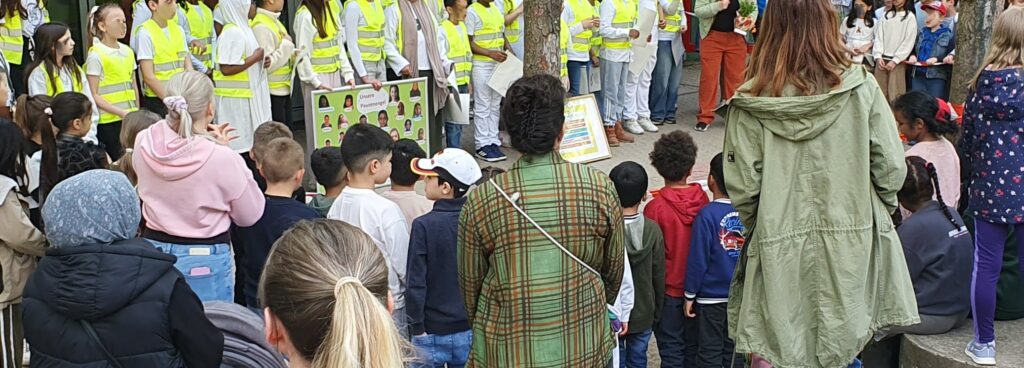 Einweihung der "Friedenshütte" auf dem Schulholhof der Grundschule Schelmengraben. Alle Schüler:innen, Lehrer:innen, aber auch die Mütter des "Fit für die Schule" KiEZ-Kurses nahmen daran aktiv teil - 16.04.26